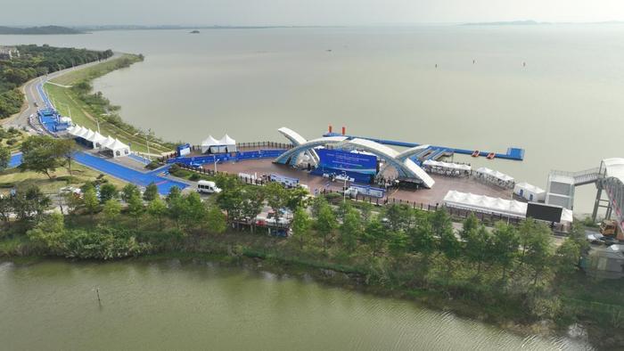 赛事场地依托梁子湖优越的自然生态条件,精心打造“水、陆、骑”三位一体的生态赛道:游泳赛段位于水质达Ⅲ类以上的梁子湖公开水域,骑行赛道穿行于入选2024“中国骑行地图”的107公里环湖绿道,跑步赛道则融合湖光山色,让选手在自然美景中完成冲刺。