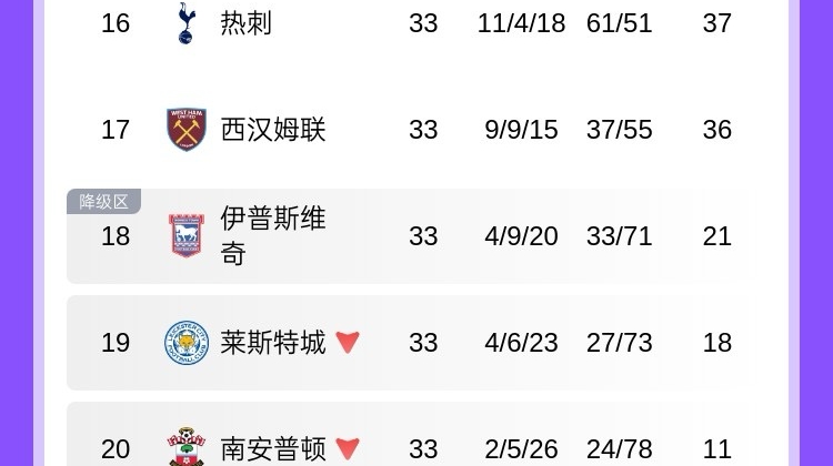 在33轮比赛过后,热刺仅拿到37分排在英超第16位。热刺战绩为11胜4平18负,进61球丢51球,净胜球10个。