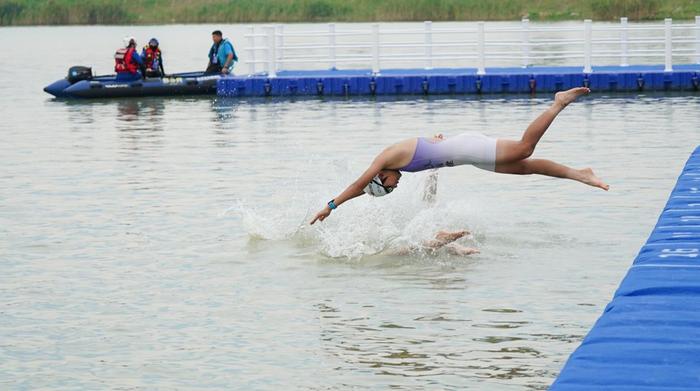 运动员熟悉游泳比赛路线训练